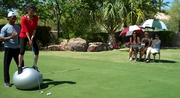 Í myndbandinu hér að neðan má sjá 59 ára gamla konu sem býr yfir ótrúlegu jafnvægi. Hún getur staðið upp á leikfimibolta og púttað um leið. Þeir sem hafa reynt að standa á slíkum bolta vita hversu erfitt það er. Að pútta á slíkum bolta er því mikið afrek. Að setja niður nokkra metra pútt, standandi á bolta og með 52‘ tommu pútter er magnað.