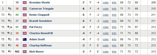 Steele er samtals á sjö höggum undir pari og er einu höggi á undan Cameron Tringale þegar aðeins lokahringurinn er eftir í mótinu. Kevin Chappell og Brandt Snedeker eru jafnir í þriðja sæti á fimm höggum undir pari.